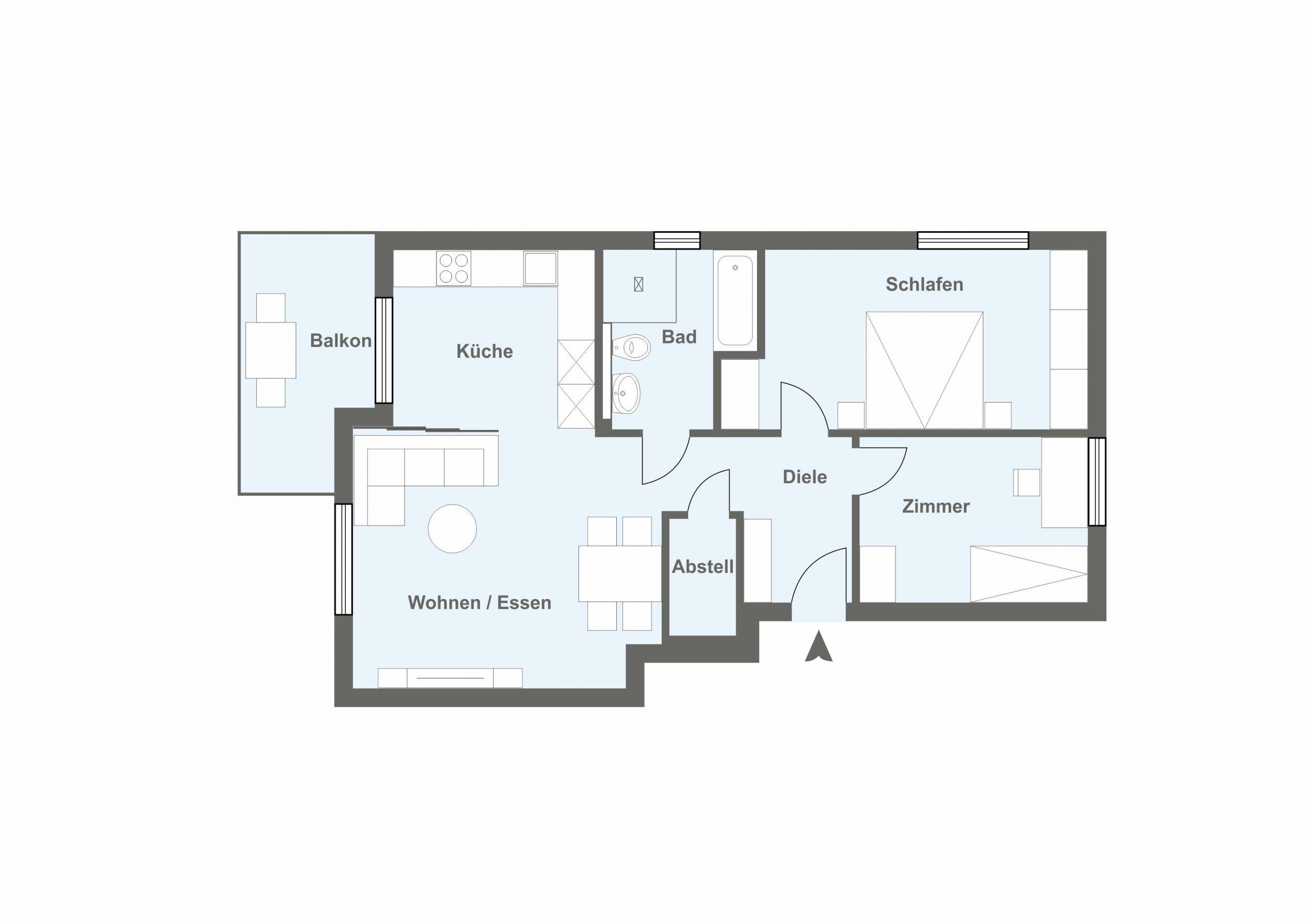 Wohnung 4 im 1. Obergeschoss überzeugt mit einem durchdachten Grundriss und großzügigen, lichtdurchfluteten Räumen. Der offene Wohn- und Essbereich bildet das Herzstück der Wohnung und öffnet sich direkt zum sonnigen Balkon.