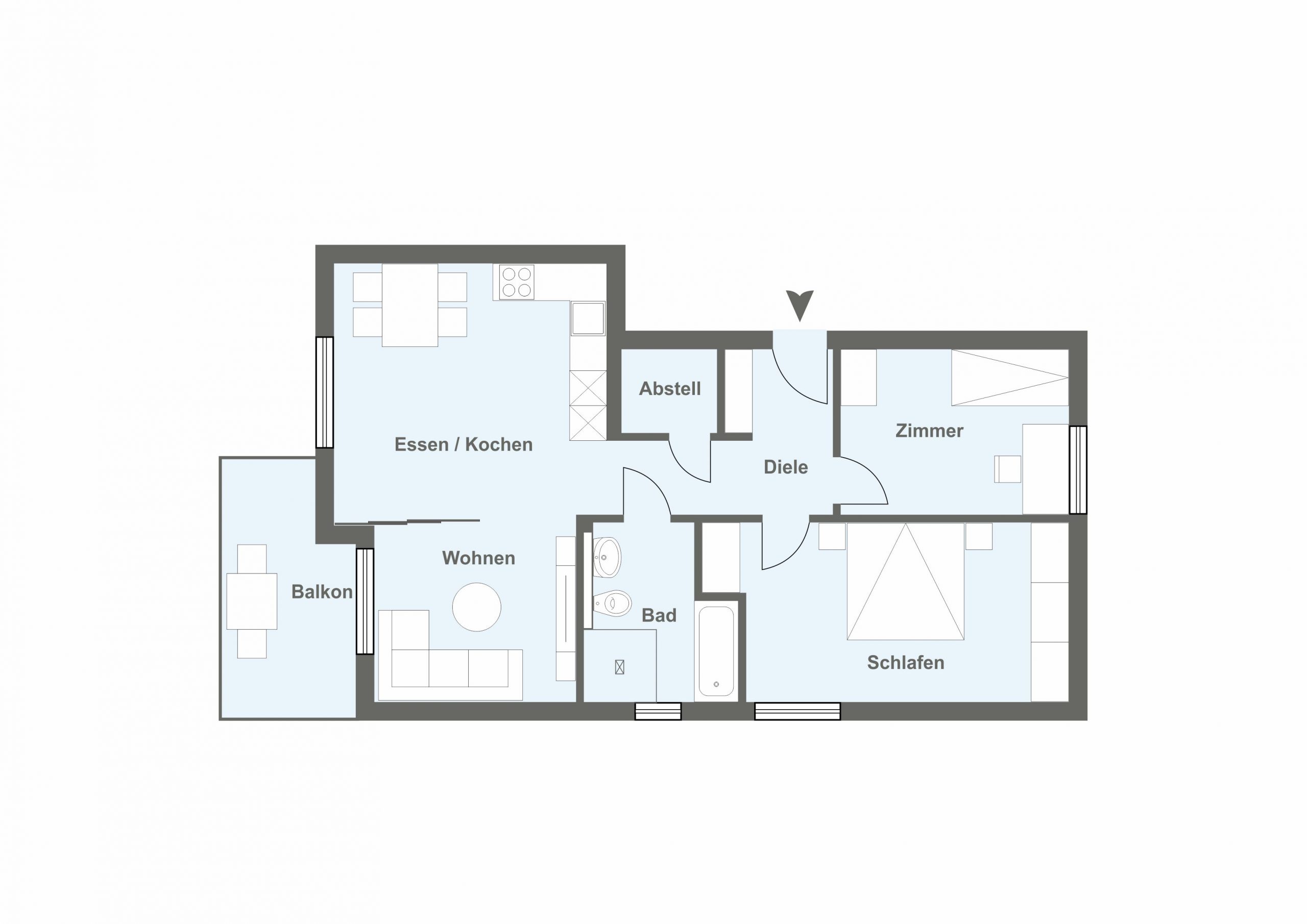 Wohnung 3 im 1. Obergeschoss überzeugt mit einem durchdachten Grundriss und großzügigen, lichtdurchfluteten Räumen. Der offene Wohn- und Essbereich bildet das Herzstück der Wohnung und öffnet sich direkt zum sonnigen Balkon.